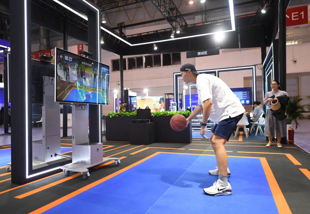 2023年8月25日,在HICOOL2023全球创业者峰会展览展示区,观众体验AI智慧体育运动系统。当日,HICOOL2023全球创业者峰会在位于北京市顺义区的中国国际展览中心(新馆)开幕。新华社记者 任超 摄