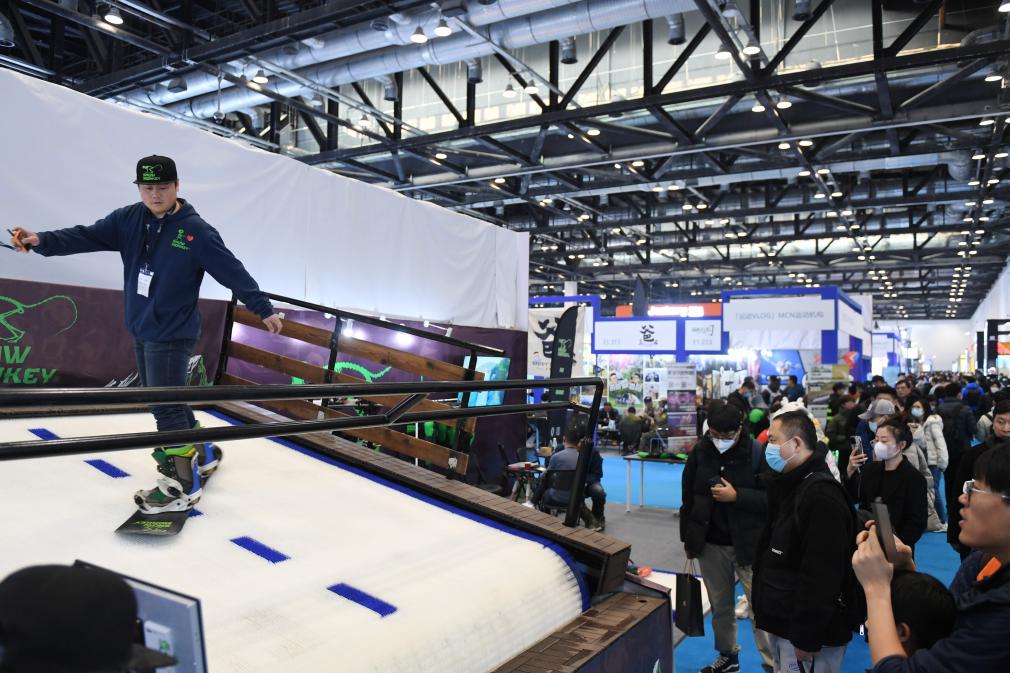 2023年2月11日,参观者在展会上了解一款模拟滑雪设备。当日,2023亚洲运动用品与时尚展在国家会议中心拉开帷幕。新华社记者 张晨霖 摄