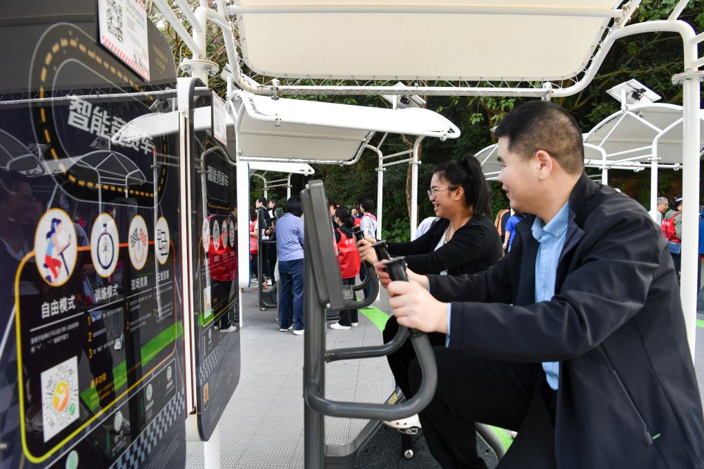 2023年4月24日,市民在福州市鼓楼区西河智慧体育公园使用智能竞赛健身车。新华社记者 林善传 摄