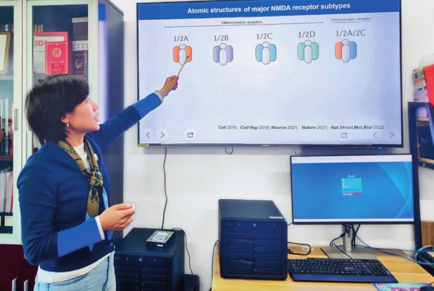 竺淑佳向记者介绍团队聚焦的NMDA受体相关研究(2025年1月摄)。董雪摄/本刊