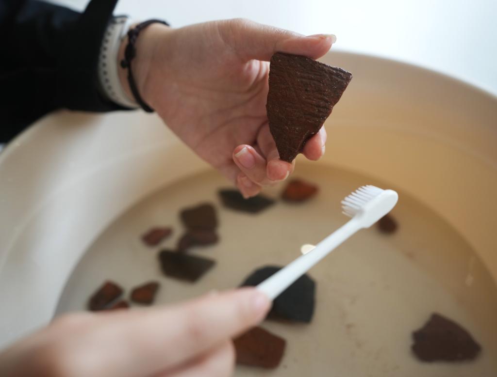 3月11日,在辽宁省朝阳市北票市的考古人员住所,考古人员在清洗调查现场发现的碎陶片。新华社记者 李钢 摄
