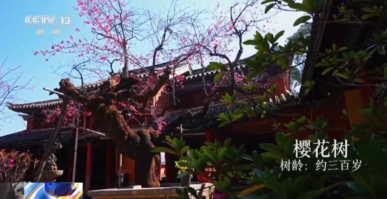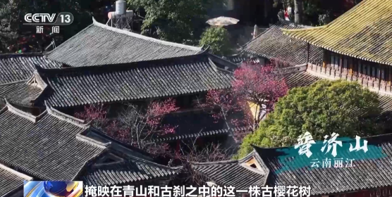 掩映在青山和古刹之中的这一株古樱花树,正如约绽放。