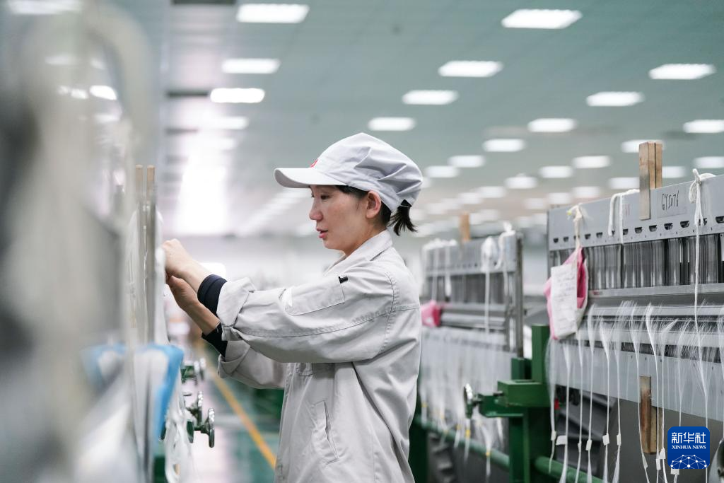 3月19日,工人在河南光远新材料股份有限公司电子布生产车间查看织机进纱情况。