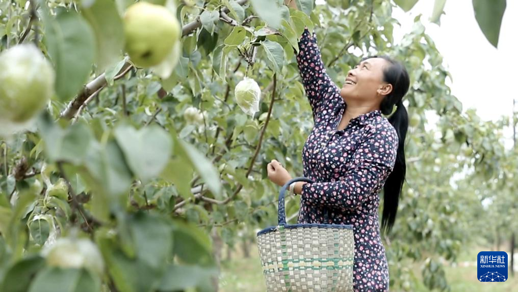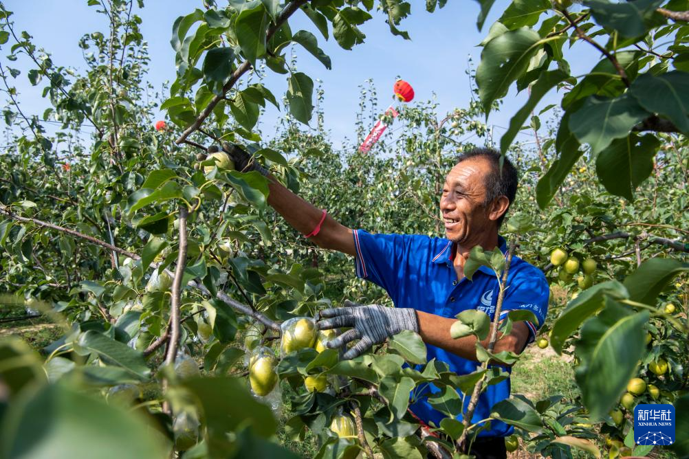 在山西隰县一处果园内,果农在采摘玉露香梨(2024年9月12日摄)。新华社记者 张哲 摄