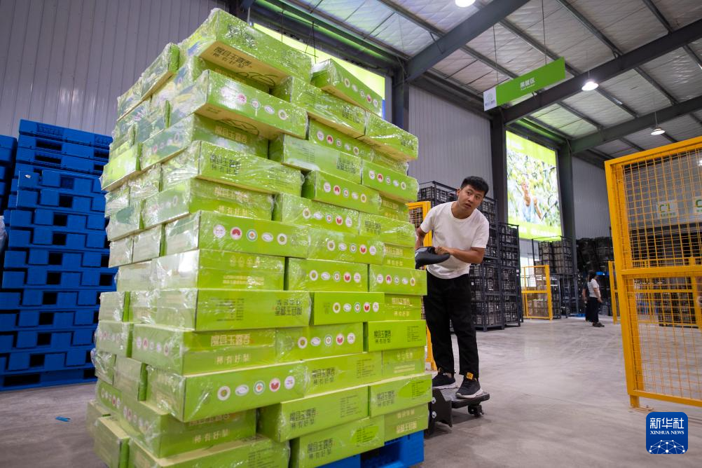 在隰县玉露香梨智能化分选基地,工作人员把包装好的玉露香梨运往出货口(2021年9月14日摄)。新华社记者 杨晨光 摄