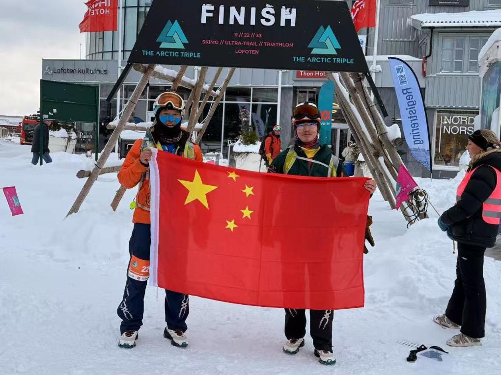 李铭(左)和王凯翔(右)在完成2025挪威罗弗敦滑雪登山赛后展示五星红旗。图片来自李铭