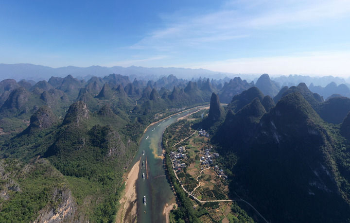 漓江,是桂林山水的灵魂。漓江山水的精华,主要集中在桂林至阳朔80多公里河段。江水清澈见底,两岸奇峰各异,近岸是翠绿的水草,凤尾竹摇曳,半空中飘浮的薄雾,笼罩山腰间,山峰隐约可见。乘船望去,漓江两岸“显山露水”,基本上看不到高楼。那一刻,分不清是在城市,还是在田园。