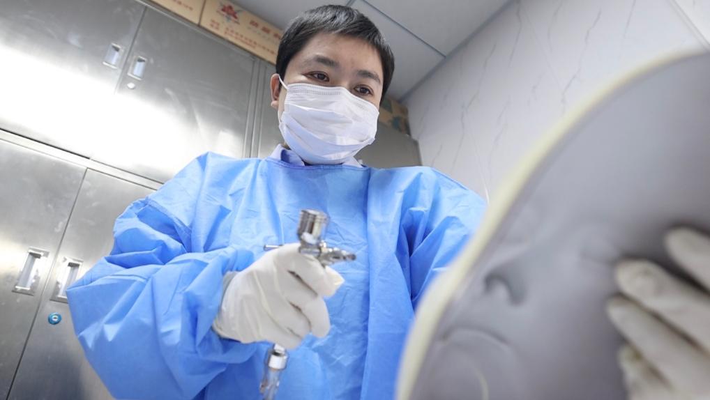 李迎正在对模具进行喷绘练习。郝杰 摄(新华社发)