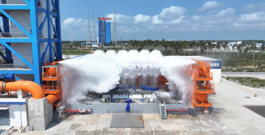 中国航天科技集团专家介绍,该系统在火箭起飞后立即启动,以27吨/秒的流量向箭体尾部火焰中心喷射扇形水幕。与此同时,一级喷水系统以6吨/秒的流量在发射平台导流槽形成保护水雾,二者协同配合,预计可将燃气流温度降低80%以上。喷水降噪系统可有效吸收声波能量,大幅度减轻火箭发射时产生的高温和噪音对发射设施的损害。