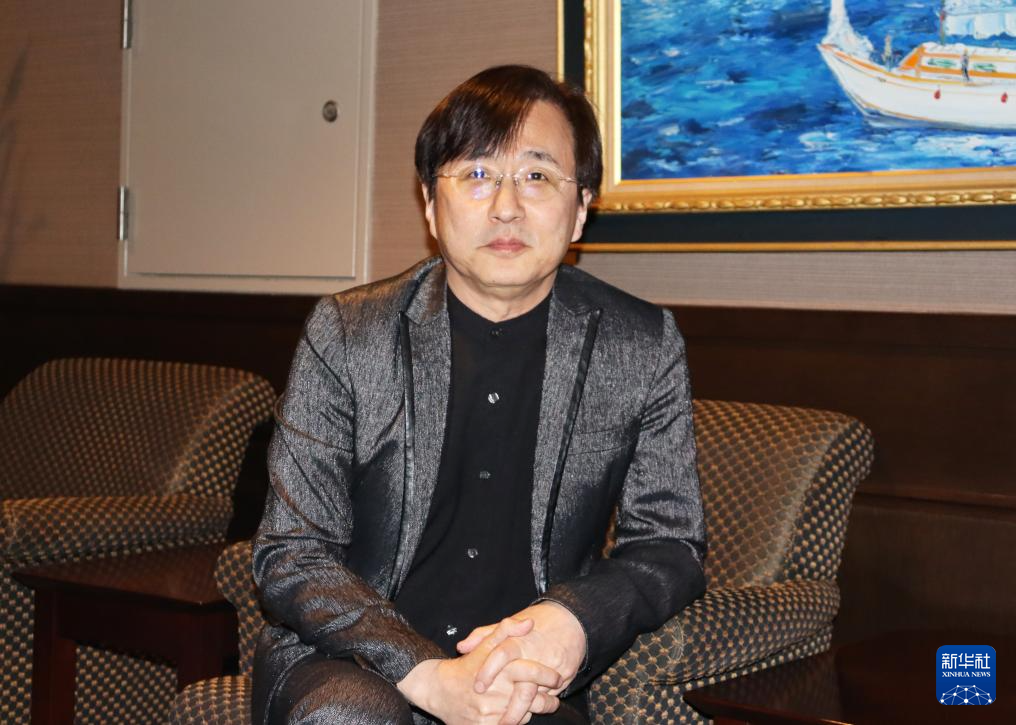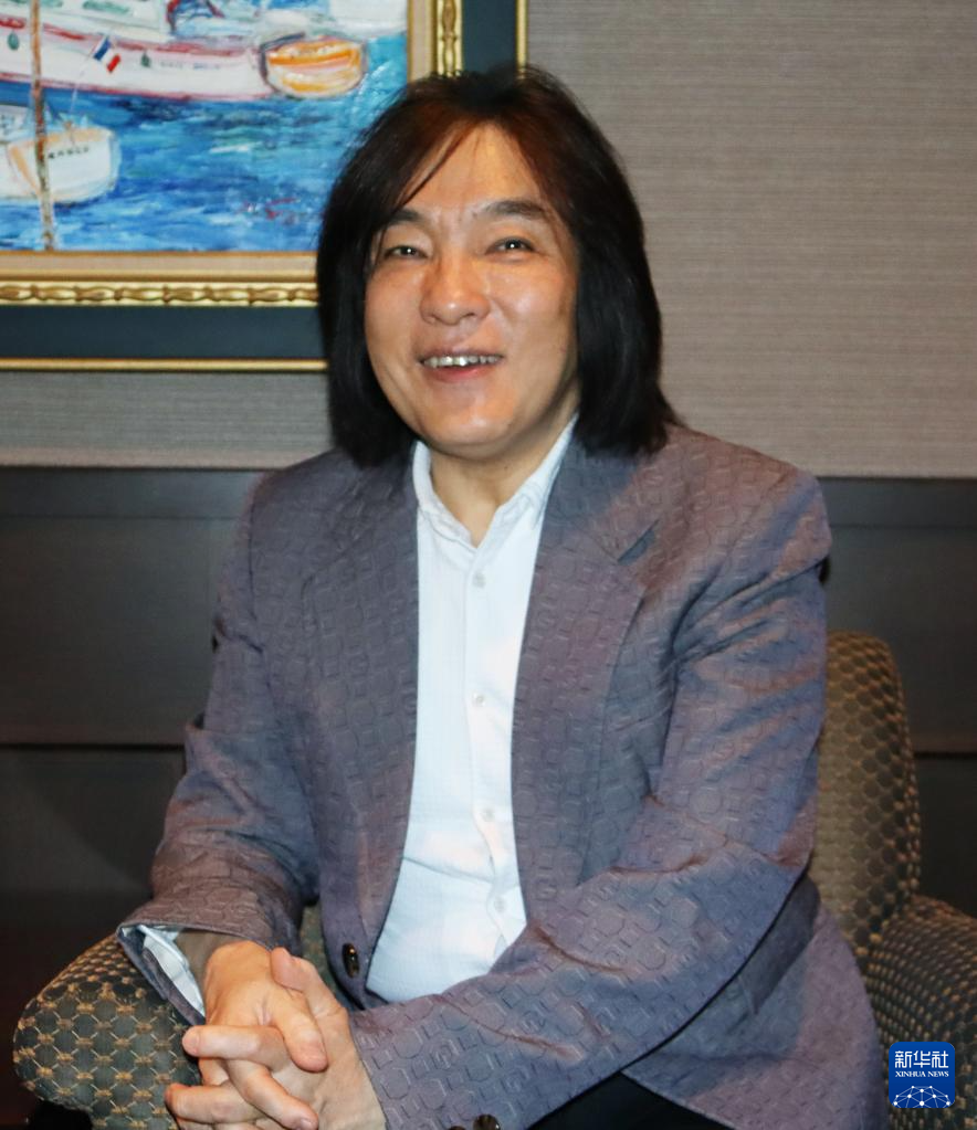 4月8日,日本作曲家和田薰在大阪交响音乐厅接受记者采访。新华社记者 杨光 摄