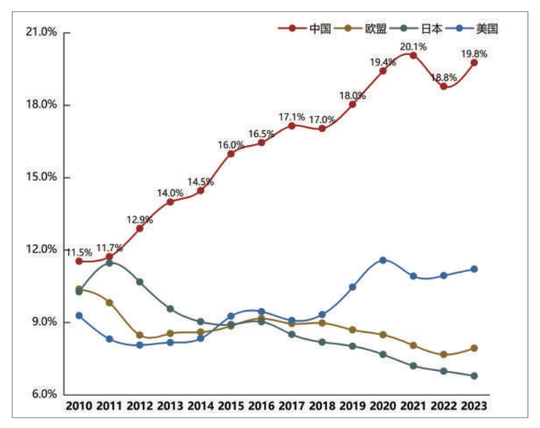 中国-东盟货物贸易额占东盟外贸总额比重已从2010年中国-东盟自贸区成立之初的11.5%上升至2023年接近20%的水平,高于东盟与其他主要贸易伙伴的贸易规模占比(图2)。