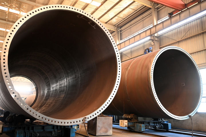 2025年3月11日,在位于张掖市高台县的甘肃创腾电力装备有限责任公司生产车间,工人在风机塔筒生产线上作业。新华社记者 范培珅 摄