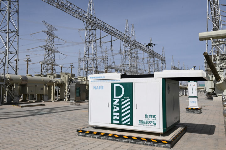2025年3月8日,在酒泉市瓜州县境内的±800千伏祁韶直流工程送端——±800千伏特高压祁连换流站,巡检无人机起飞准备巡检。新华社记者 范培珅 摄