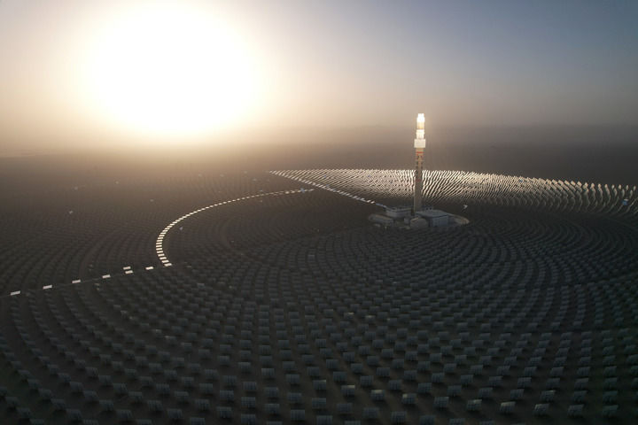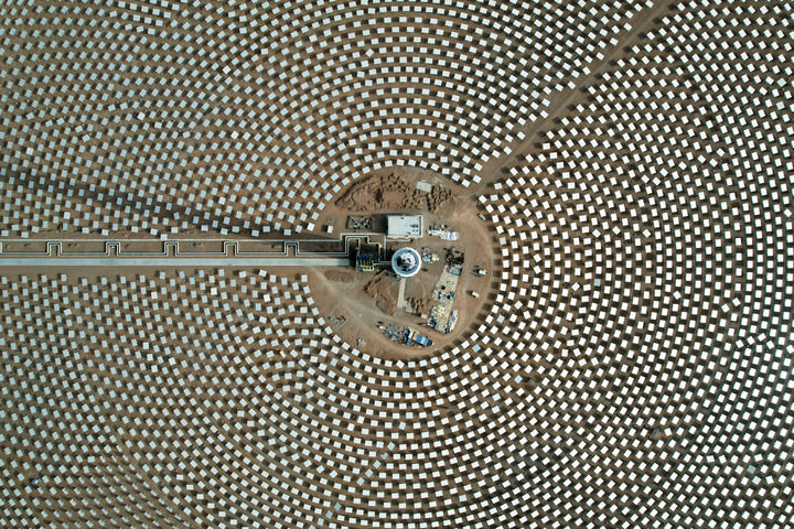 瓜州境内的广袤戈壁滩上,两座约200米高的吸热塔拔地而起,比肩而立;高塔四周,近2.7万面定日镜以同心圆的方式紧密环绕,组成占地4400多亩的巨大反射镜场,相当于411个标准足球场大小。
