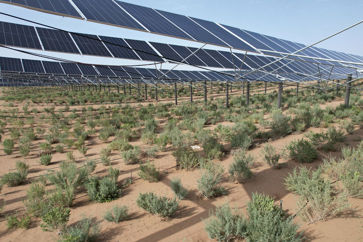 与传统光伏板的建造形式不同,该项目光伏板架设高度达4米,配置双面光伏板发电,发电效率提高了8%至15%。板上发电、板下种植,一地多用,立体发展。截至目前,武威已规划建设占地50万亩、总装机容量达1500万千瓦的光伏治沙产业园,成为西北地区重要的光伏治沙产业园区。