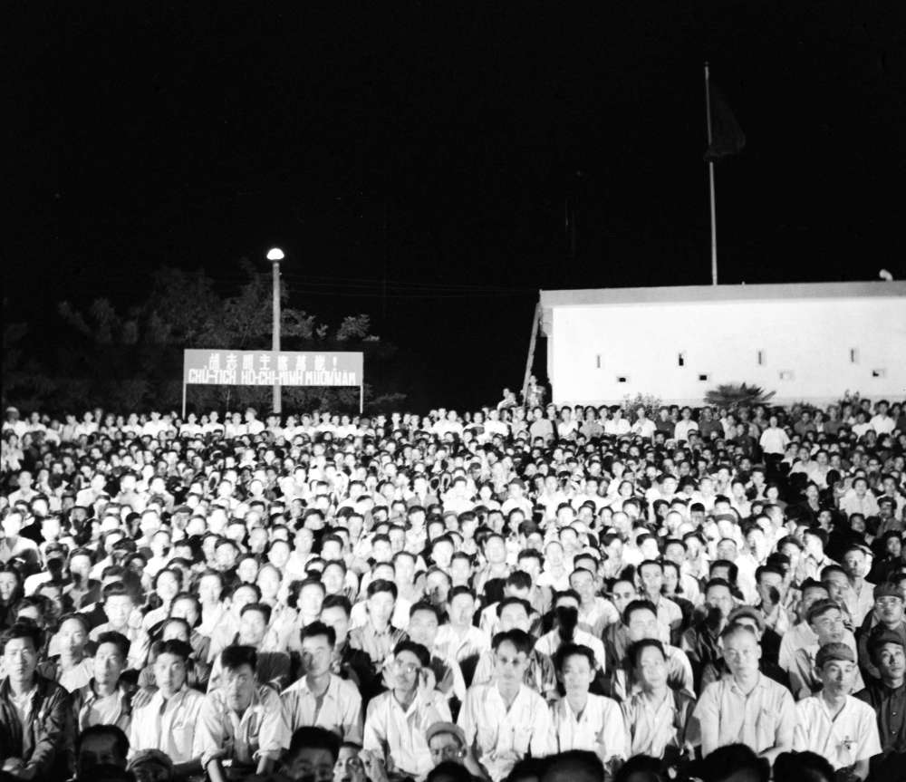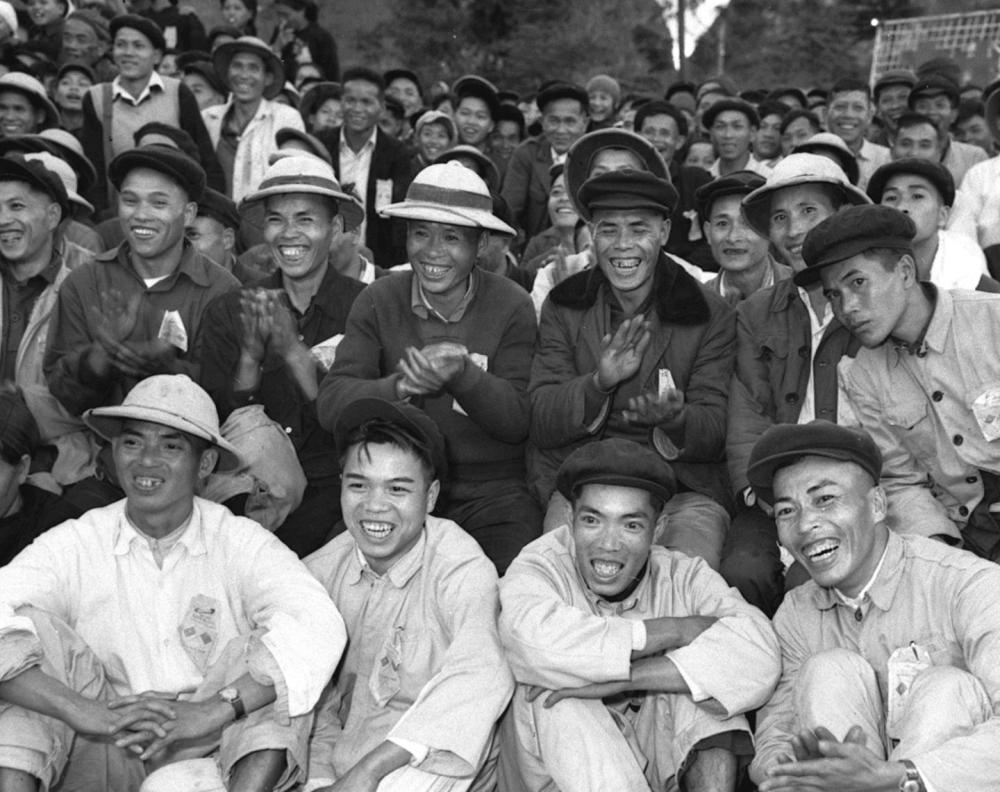 1959年12月,来自越南的客人在两国边境居民庆祝共建水利工程完工联欢会上观看演出。