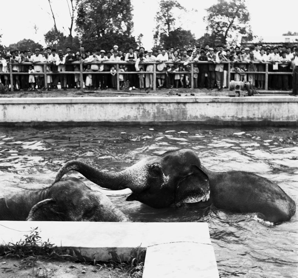 1954年7月,观众在北京西郊公园动物园观看越南等国家赠送的大象。