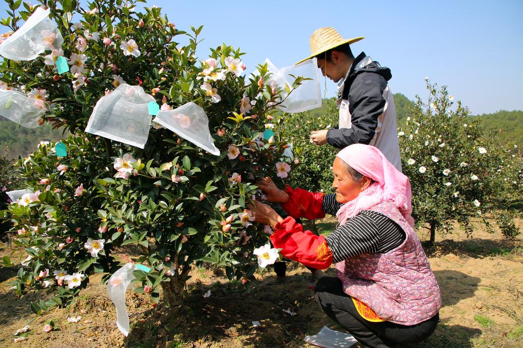2025年3月,威宁县农民在农技专家指导下对短柱油茶树进行人工授粉。(彭凯摄)