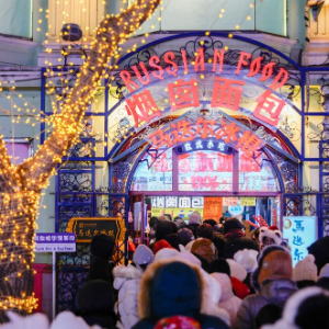 2025年1月30日,游客在哈尔滨中央大街上排队购买美食。新华社记者王建威摄