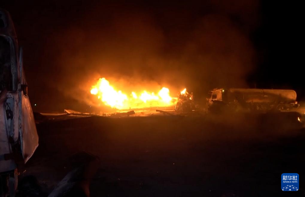 4月17日,在也门荷台达省伊萨角港,遭美军空袭的车辆燃起大火(视频截图)。新华社发
