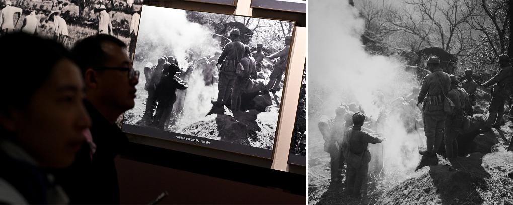 拼版照片:左图为观众参观位于北京的中国人民革命军事博物馆(新华社记者刘金海2025年4月6日摄);右图为雷烨摄影作品《熊熊的篝火》(受访者提供)。