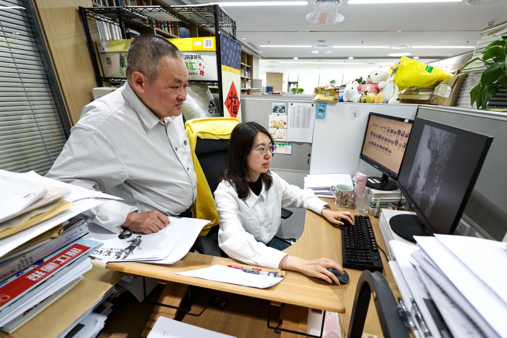 2025年4月15日,作家李英(左)来到位于杭州的浙江摄影出版社,与编辑朱丽莎商讨雷烨作品集的编辑出版事宜。目前,为纪念抗战胜利八十周年,李英与雷烨外甥女项碧英正在共同推动出版雷烨的作品集。新华社记者 刘金海 摄
