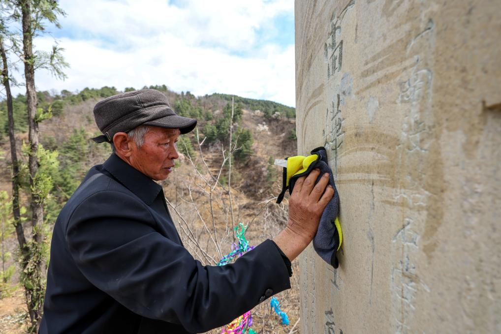 清明节前,河北省平山县南段峪村村民、雷烨希望小学退休教师王海军祭扫“雷烨烈士纪念碑”(2025年3月31日摄)。新华社记者 刘金海 摄