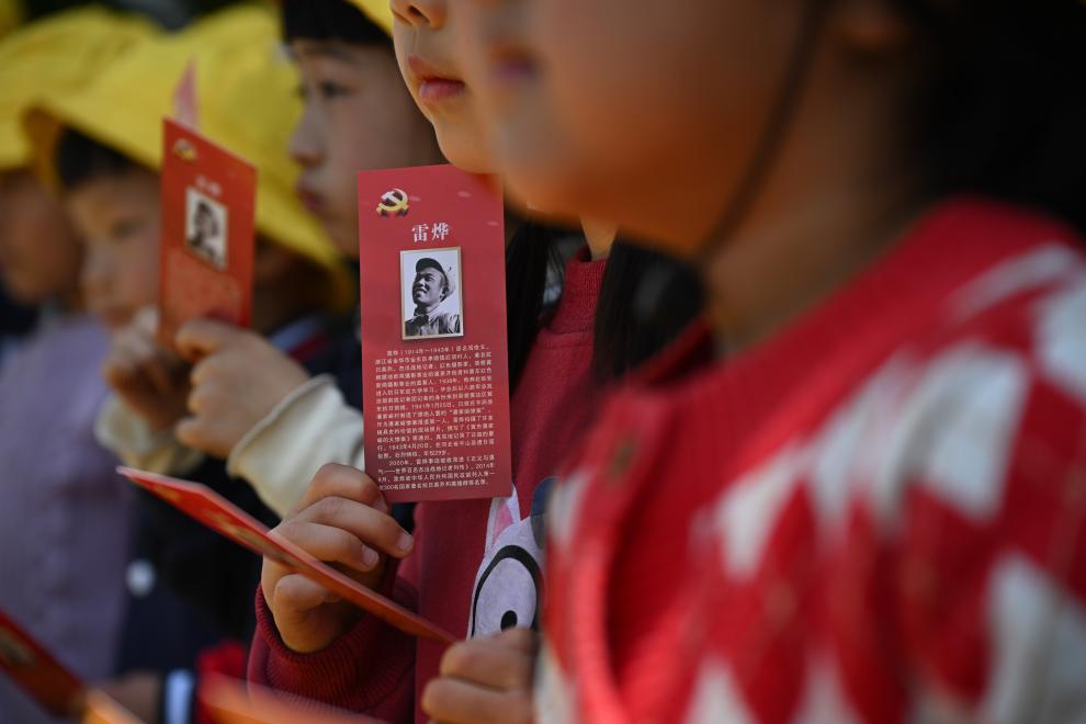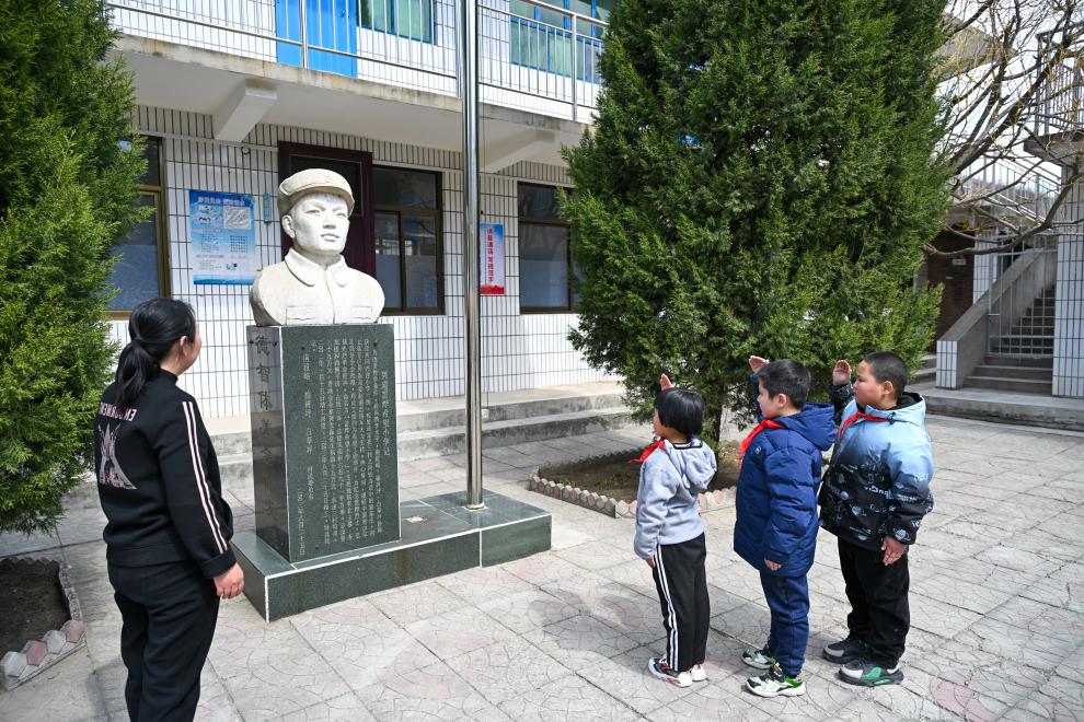 清明节前,河北省平山县雷烨希望小学师生共同缅怀雷烨烈士(2025年3月31日摄)。新华社记者 刘金海 摄