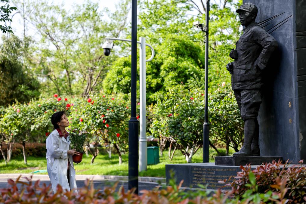 2025年4月14日,项碧英前往“抗战英烈”雕塑凭吊雷烨烈士。新华社记者 刘金海 摄