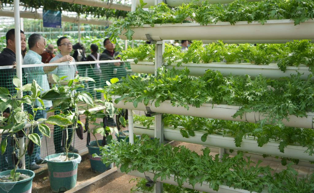 4月20日,在第二十六届中国(寿光)国际蔬菜科技博览会上,人们在观看先进种植模式展示。新华社记者徐速绘 摄
