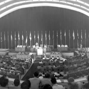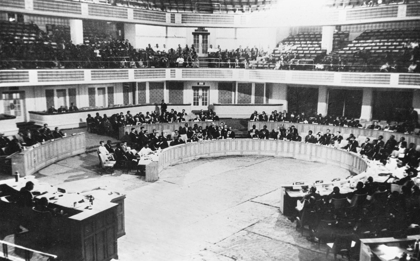 1955年4月18日至24日,29个亚非国家和地区的政府代表团在印度尼西亚万隆召开亚非会议。图为万隆亚非会议会场内景。新华社记者钱嗣杰摄