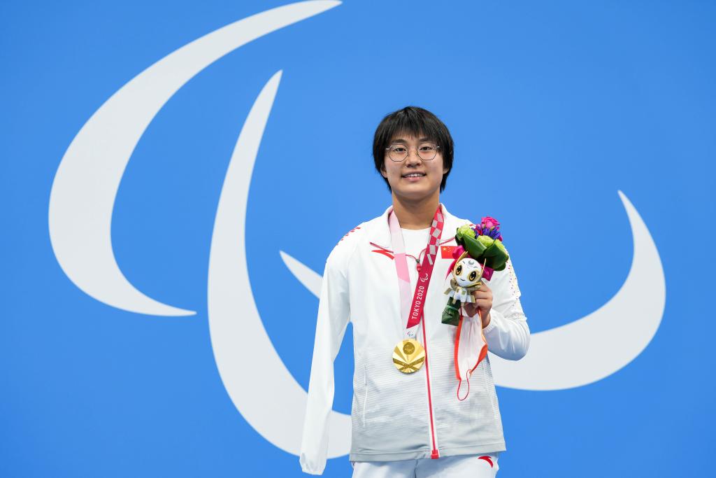 ↑2021年8月30日,获得冠军的蒋裕燕在东京残奥会游泳女子50米蝶泳S6级颁奖仪式上。新华社记者 张铖 摄