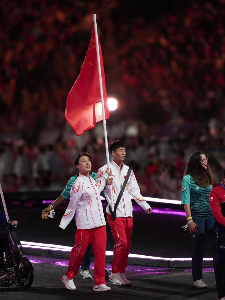 ↑2024年9月8日,巴黎残奥会中国体育代表团旗手女子游泳运动员蒋裕燕(左一)和男子田径运动员邸东东(左二)在第17届夏季残疾人奥林匹克运动会闭幕式上入场。新华社记者 黄伟 摄