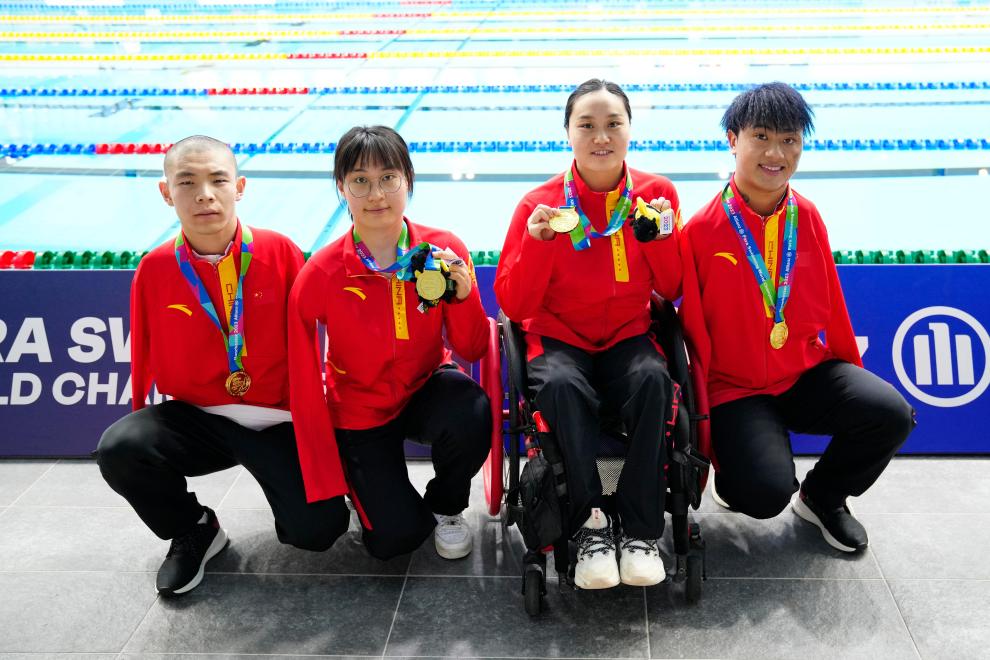 ↑2023年8月2日,中国队选手郭金城、蒋裕燕、成姣、袁伟译(从左至右)在赛后合影。 当日,在英国曼彻斯特举行的残疾人游泳世界锦标赛男女混合4X50米混合泳接力决赛中,中国队以2分27秒45的成绩获得冠军并创造新的世界纪录。 新华社发(乔恩·休珀摄)