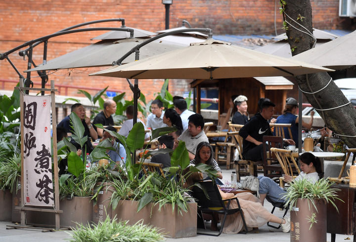 4月16日,消费者在重庆市九龙坡区谢家湾街道民主村社区一茶饮店休闲。周邦静摄