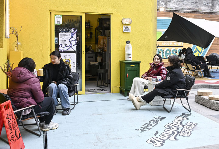 消费者在重庆市江北区大石坝街道忠恕沱社区一饮品店外休闲、聊天(2月24日摄)。新华社记者王全超摄