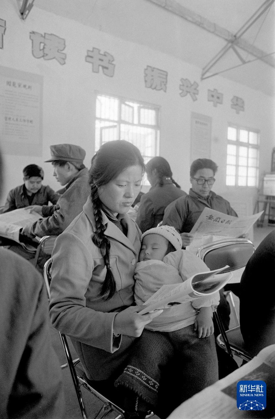 1984年,在安徽天长郑集公社(现郑集镇)文化中心图书阅览室内,一位母亲抱着熟睡的孩子在阅读。