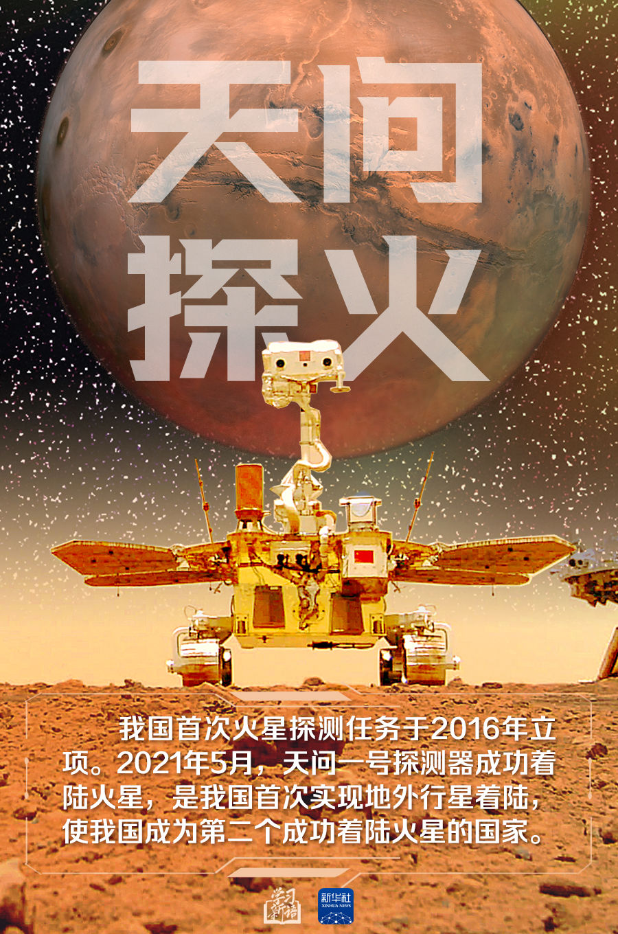 2021年5月,天问一号探测器成功着陆于火星乌托邦平原南部预选着陆区,我国首次火星探测任务着陆火星取得成功。习近平总书记致电祝贺。总书记在贺电中指出,天问一号探测器着陆火星,迈出了我国星际探测征程的重要一步,实现了从地月系到行星际的跨越,在火星上首次留下中国人的印迹,这是我国航天事业发展的又一具有里程碑意义的进展。总书记强调,希望你们再接再厉,精心组织实施好火星巡视科学探测,坚持科技自立自强,精心推进行星探测等航天重大工程,加快建设航天强国,为探索宇宙奥秘、促进人类和平与发展的崇高事业作出新的更大贡献!