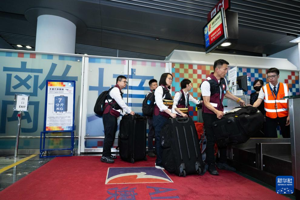 4月24日,中国国际应急医疗队(澳门)在澳门国际机场办理登机手续。新华社发(张金加摄)