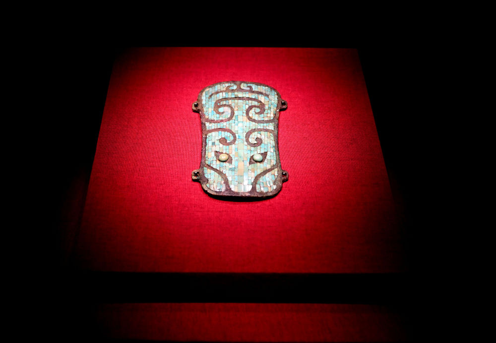 这是2025年4月16日在位于河南省洛阳市偃师区的二里头夏都遗址博物馆拍摄的镶嵌绿松石兽面纹铜牌饰。新华社记者 李嘉南 摄