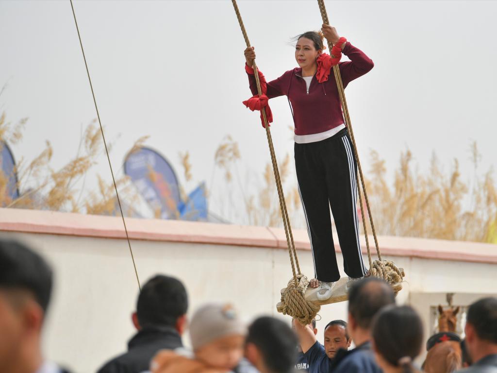 村民在于田县先拜巴扎镇农牧民运动场参加秋千比赛。新华社记者 胡虎虎 摄