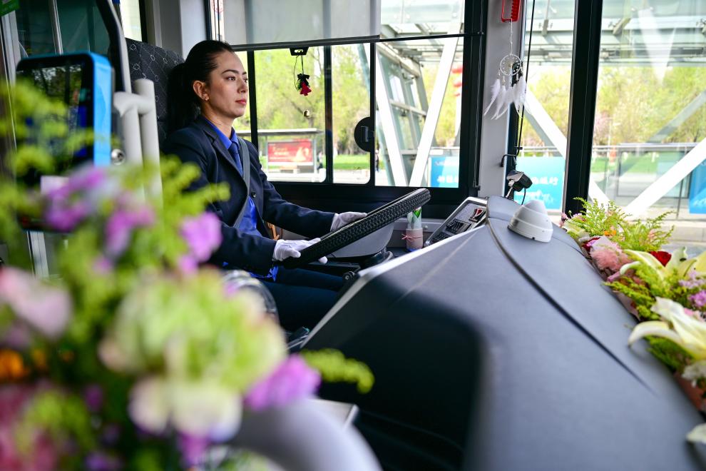 “2路印记·城市畅游专线”驾驶员哈力坦木·依明江正在运送乘客(4月22日摄)。新华社记者 丁磊 摄