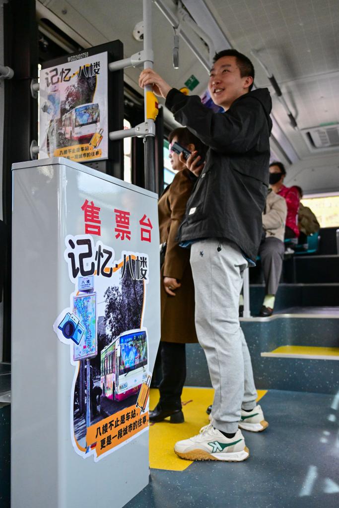 “2路印记·城市畅游专线”上设置了售票台、票夹、报站器等打卡物件(4月22日摄)。新华社记者 丁磊 摄