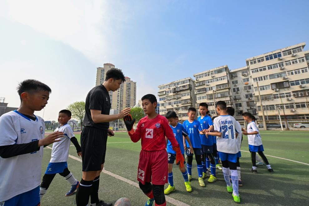 ↑2025年4月16日,双方球员在天津市足球协会指派的裁判员带领下互相击掌致意。当日,在天津市河西区土城小学举行的2024-2025河西区“哪吒杯”中小学校园足球联赛男子乙组比赛中,土城小学队2比1战胜东楼小学队。新华社记者 孙凡越 摄