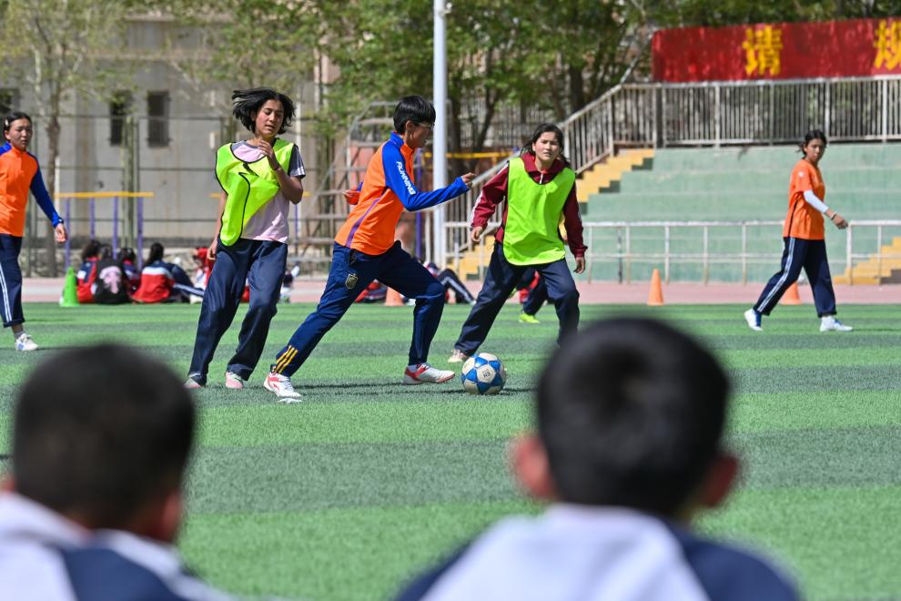 ↑2025年4月10日,在新疆克孜勒苏柯尔克孜自治州阿图什市硝鲁克中学,阿图什市U13女子足球队球员在训练中进行分组比赛。新华社记者 徐宏岩 摄