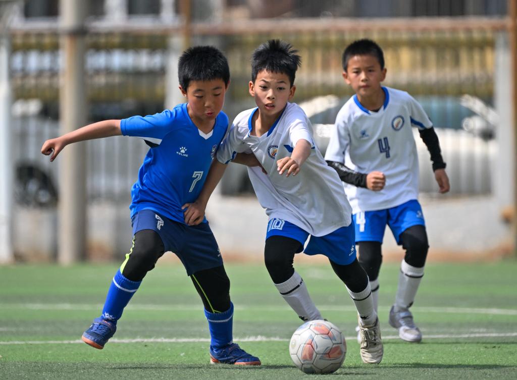 ↑2025年4月16日,天津市河西区东楼小学队球员马彬轩(左)与天津市河西区土城小学队球员付腾羽(中)拼抢。新华社记者 孙凡越 摄