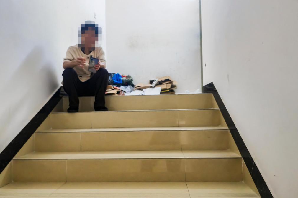 在广西某市一个商场,由于没有固定的休息室,保洁员只能在楼梯间里吃饭、休息(4月15日摄,拼版照片)。