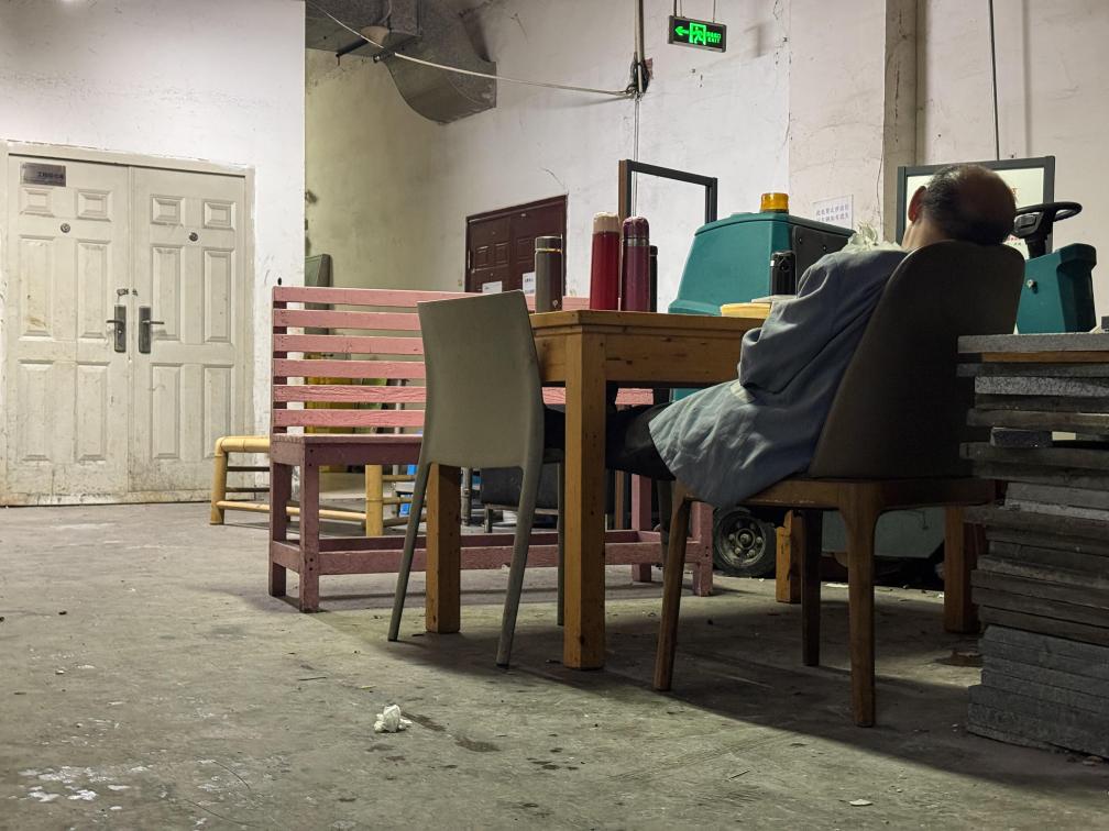 保洁员在四川某市一处美食城地下停车场休息(4月21日摄)。