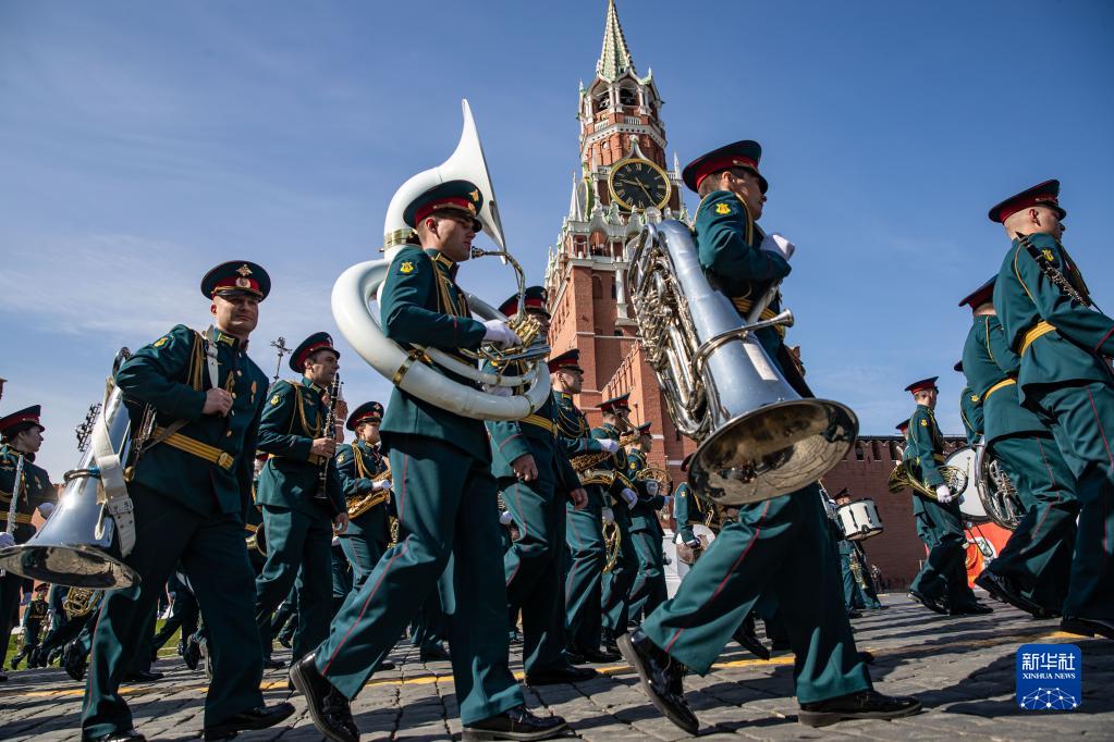 5月7日,在俄罗斯首都莫斯科,军乐团在总彩排开始前列队行进。新华社记者 白雪骐 摄
