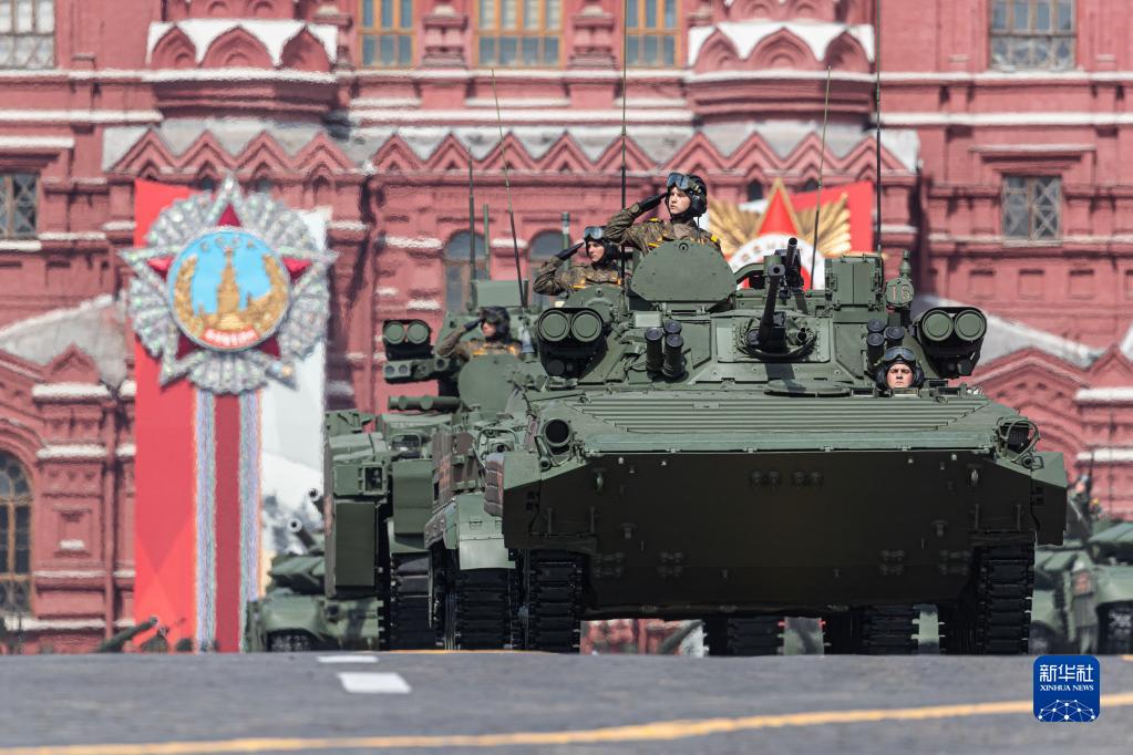 5月7日,在俄罗斯首都莫斯科,步兵战车编队驶过红场。新华社记者 白雪骐 摄